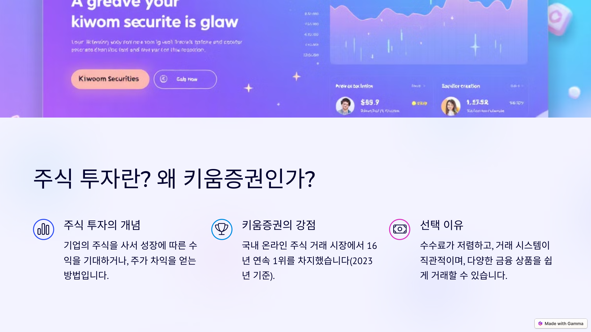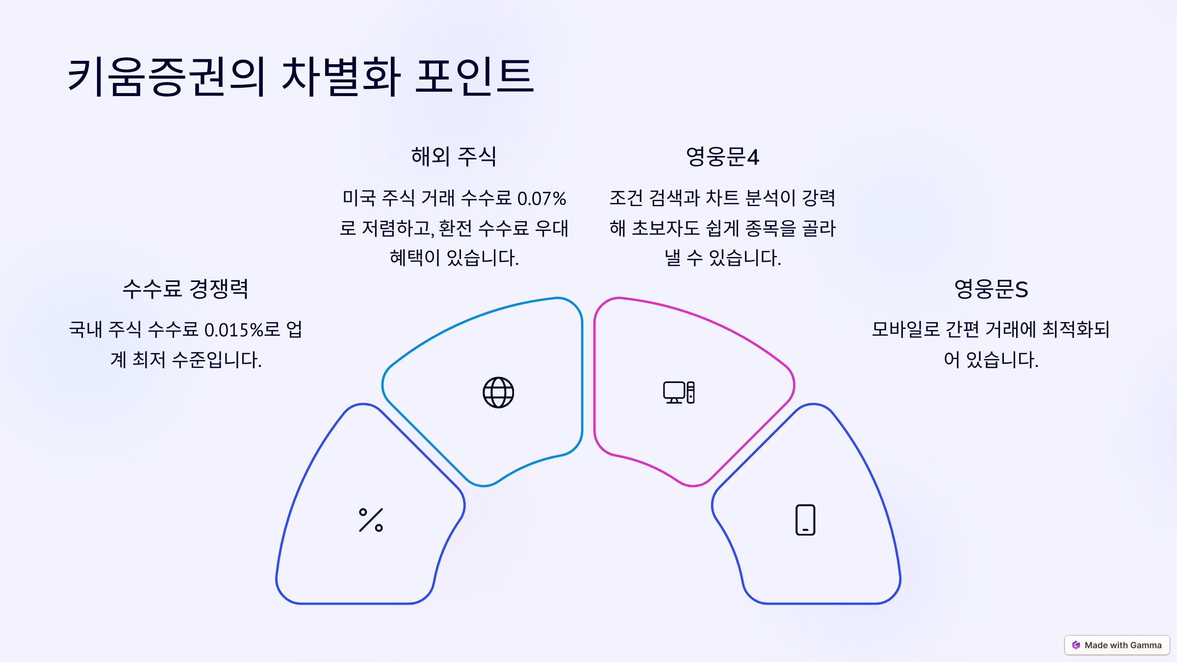 - 왜 키움인가?: 수수료가 저렴하고, HTS(홈트레이딩시스템)와 MTS(모바일트레이딩시스템)가 직관적이며, 해외 주식과 다양한 금융 상품을 쉽게 거래할 수 있어요.