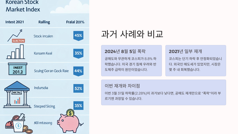 2021년 5월 공매도 일부 재개 시 코스피는 단기 하락 후 안정화됐습니다. 당시 외국인 매도세가 있었지만, 시장은 몇 주 내 회복했어요. 이를 보면 이번 폭락도 일시적일 가능성이 있습니다.
