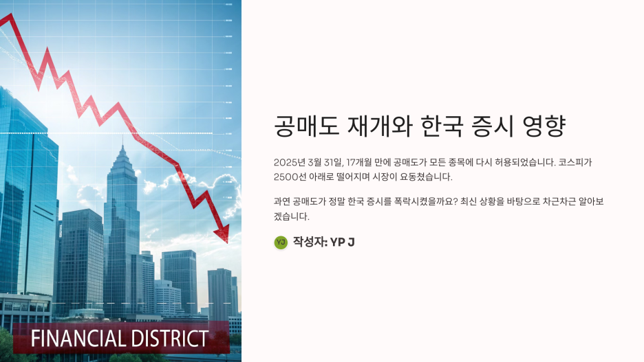 안녕하세요, 여러분! 오늘은 한국 증시에서 뜨거운 이슈인 공매도 전면 재개와 그로 인한 "증시 폭락" 논란에 대해 이야기해보려고 합니다. 2025년 3월 31일, 17개월 만에 공매도가 모든 종목에 다시 허용되면서 시장이 요동쳤어요. 코스피가 2500선 아래로 떨어졌다는 뉴스가 속속 올라오고, 투자자들 사이에선 불안과 혼란이 커지고 있죠. 과연 공매도가 정말 한국 증시를 폭락시켰을까요? 최신 상황을 바탕으로 도표와 함께 차근차근 알아볼게요!