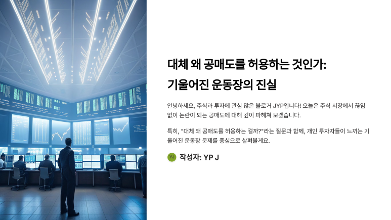 안녕하세요, 주식과 투자에 관심 많은 블로거 JYP입니다! 오늘은 주식 시장에서 끊임없이 논란이 되는 공매도에 대해 깊이 파헤쳐 보겠습니다. 특히, "대체 왜 공매도를 허용하는 걸까?"라는 질문과 함께, 개인 투자자들이 느끼는 기울어진 운동장 문제를 중심으로 공매도의 필요성, 문제점, 그리고 그 이면을 분석해 볼게요. 공매도가 시장에 미치는 영향과 허용 이유를 알면 투자 전략에도 큰 도움이 될 거예요!
