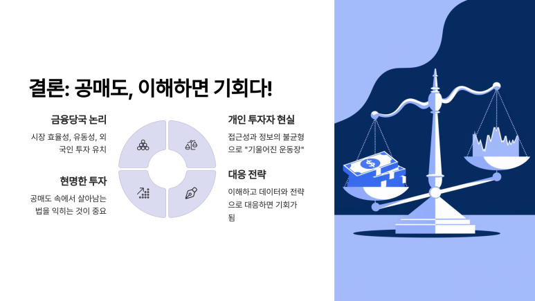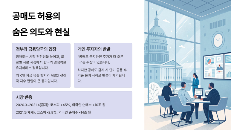 - 의도: 공매도는 시장 건전성을 높이고, 글로벌 자본 시장에서 한국의 경쟁력을 유지하려는 정책.