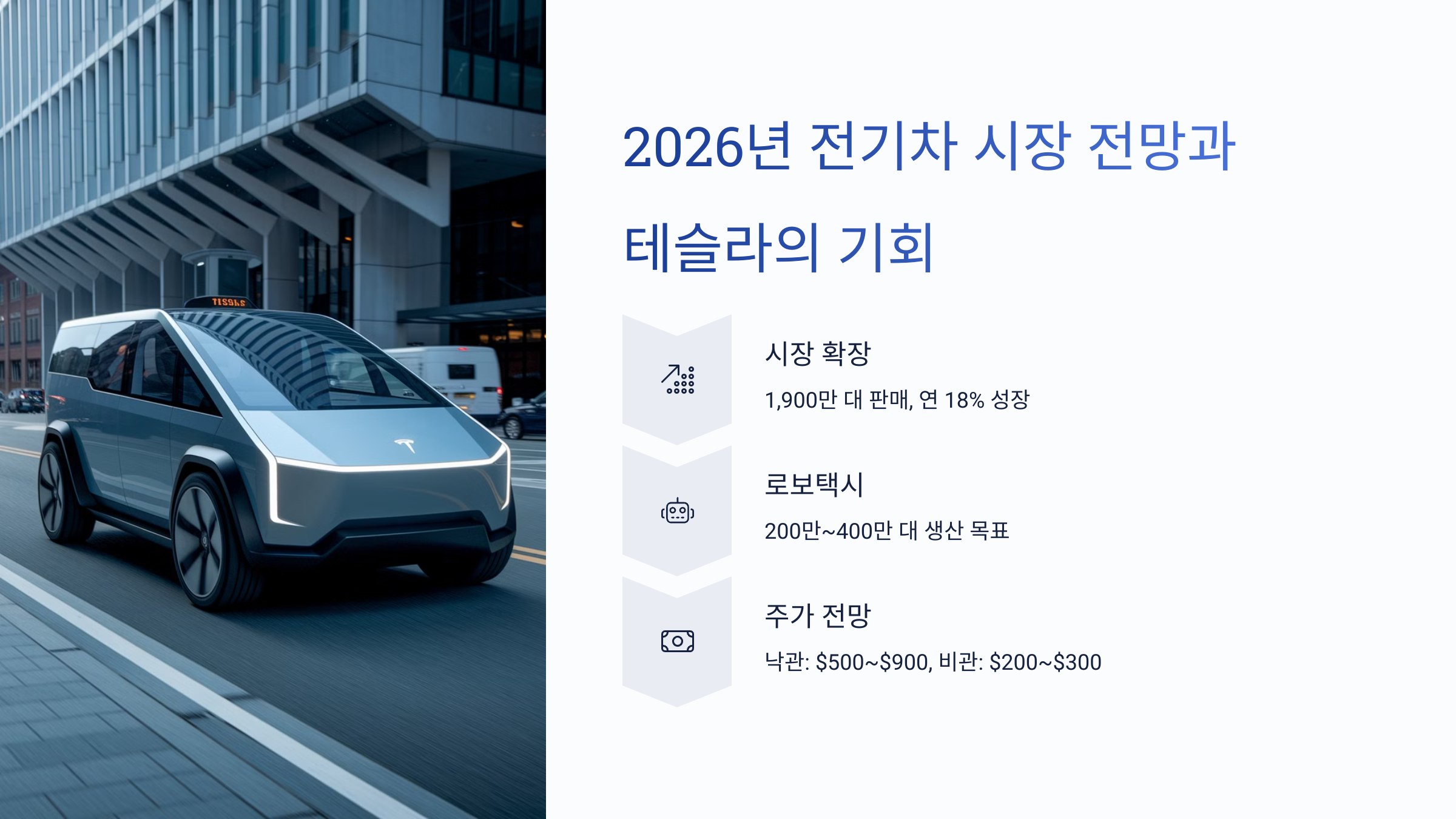 - 예상: 2026년 EV 판매 1,900만 대(연 18%↑), 자율주행차 비중 10% 돌파(Ark Invest). 금리 인하(3% 예상)로 수요 증가 가능.