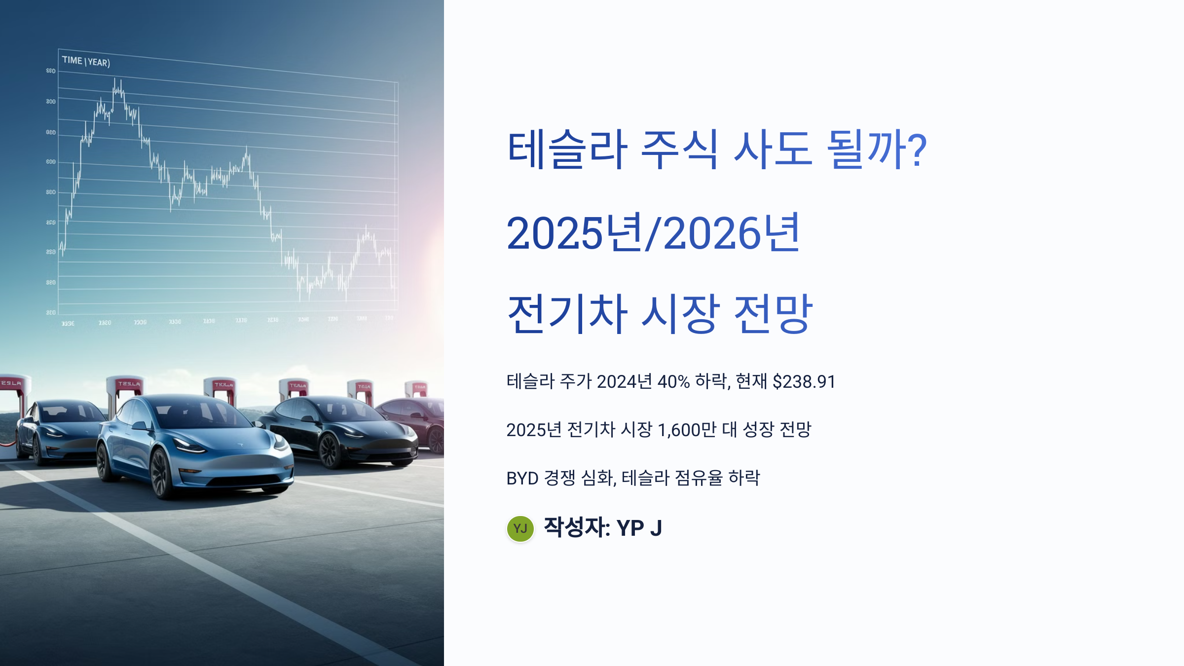 안녕하세요, 주식과 투자에 관심 많은 블로거 JYP입니다! 2025년 4월 6일 오전 7시 20분(한국 시간) 현재, "테슬라 주식(TSLA) 사도 될까?"라는 질문이 투자자들 사이에서 뜨거워요. 여론에 따르면 "테슬라는 전기차 왕이지만 최근 주가 하락이 무섭다" "엘론 머스크 믿고 투자해도 되나?" 같은 고민이 많죠. 실제로 2024년 테슬라 주가는 연초 $403에서 4월 기준 $238.91(Statista 기준)까지 약 40% 하락하며 변동성이 컸어요. 코스피도 2,350선으로 내려앉고, 환율은 1,450원을 넘어서며 경제 불안이 커진 지금, 과연 테슬라 주식은 매수 기회일까요? 이 글에서는 2025년과 2026년 전기차 시장 전망을 바탕으로 테슬라 주식의 투자 가능성을 분석해 봤습니다.