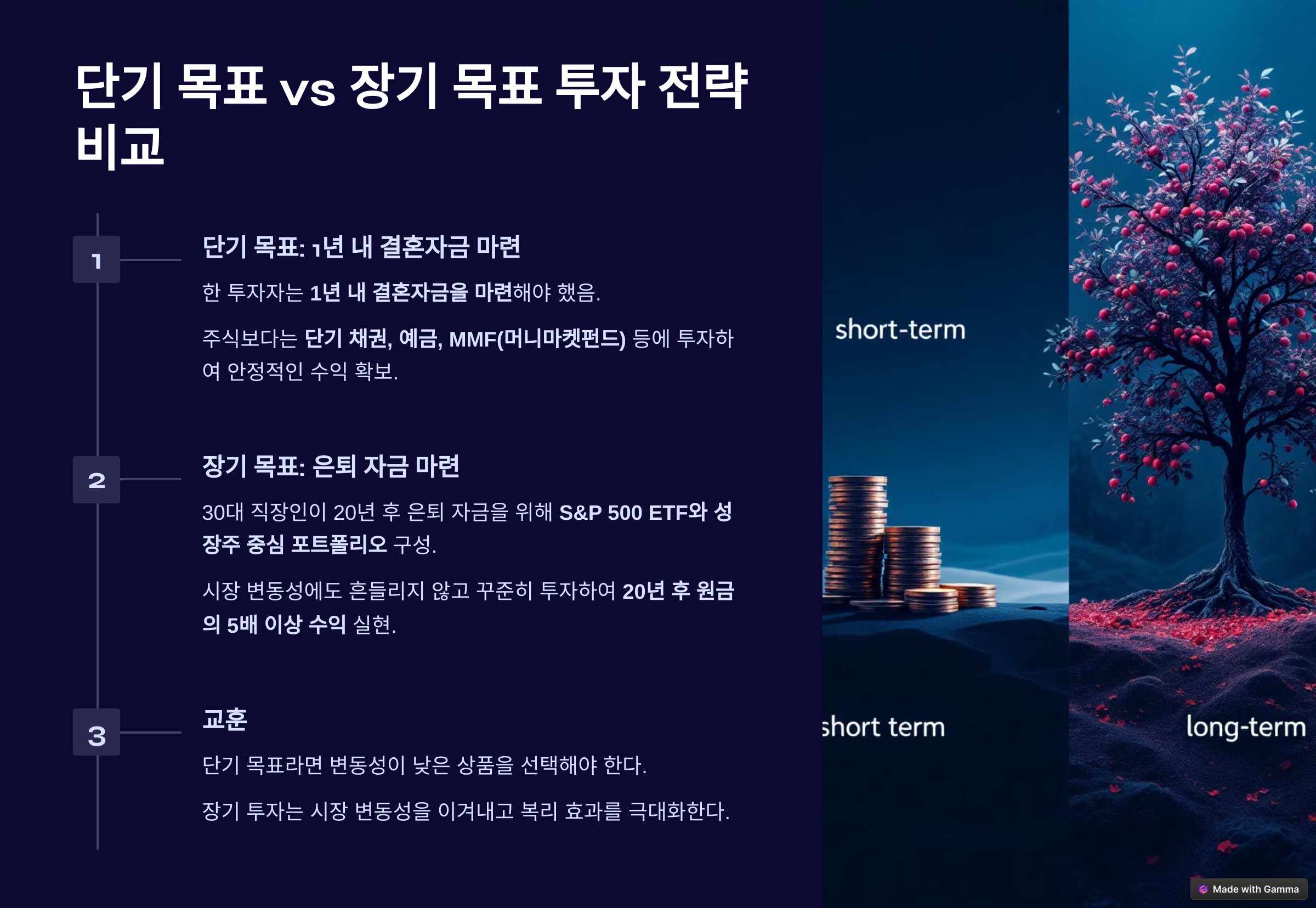 - 단기 목표 vs 장기 목표 투자 전략 비교