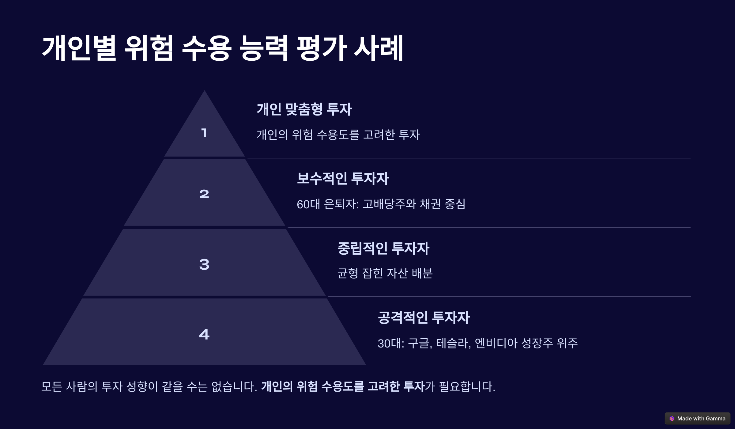 모든 사람의 투자 성향이 같을 수는 없습니다. 개인의 위험 수용도를 고려한 투자가 필요합니다.