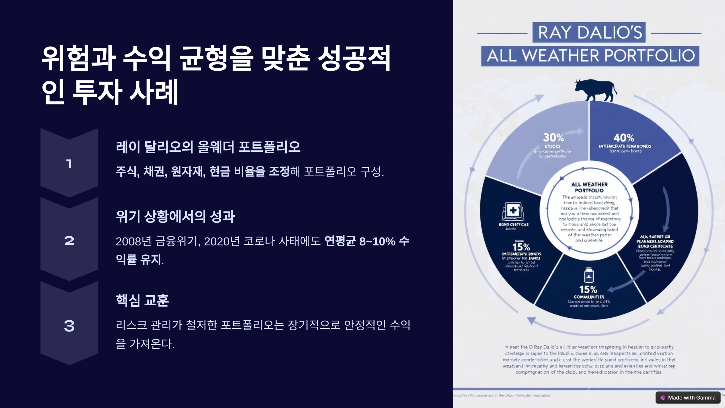 - 교훈: 단순히 주식만이 아니라, 대체 자산에도 분산 투자해야 한다.
