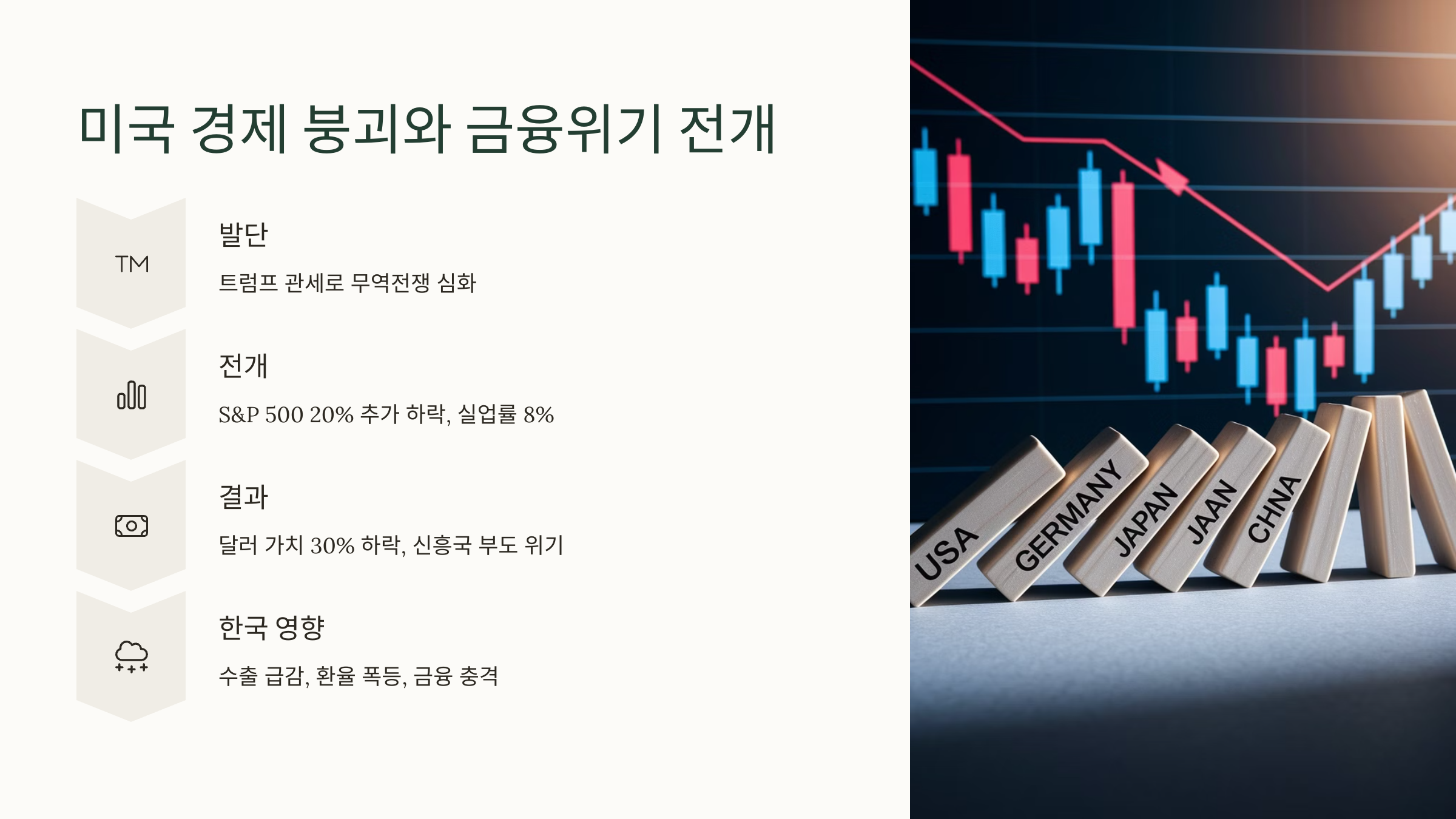 - 전개: S&P 500 20% 추가 하락(2,200선), 실업률 5%→8%(애틀랜타 연은 추정), GDP -2% 역성장(2025년 하반기).