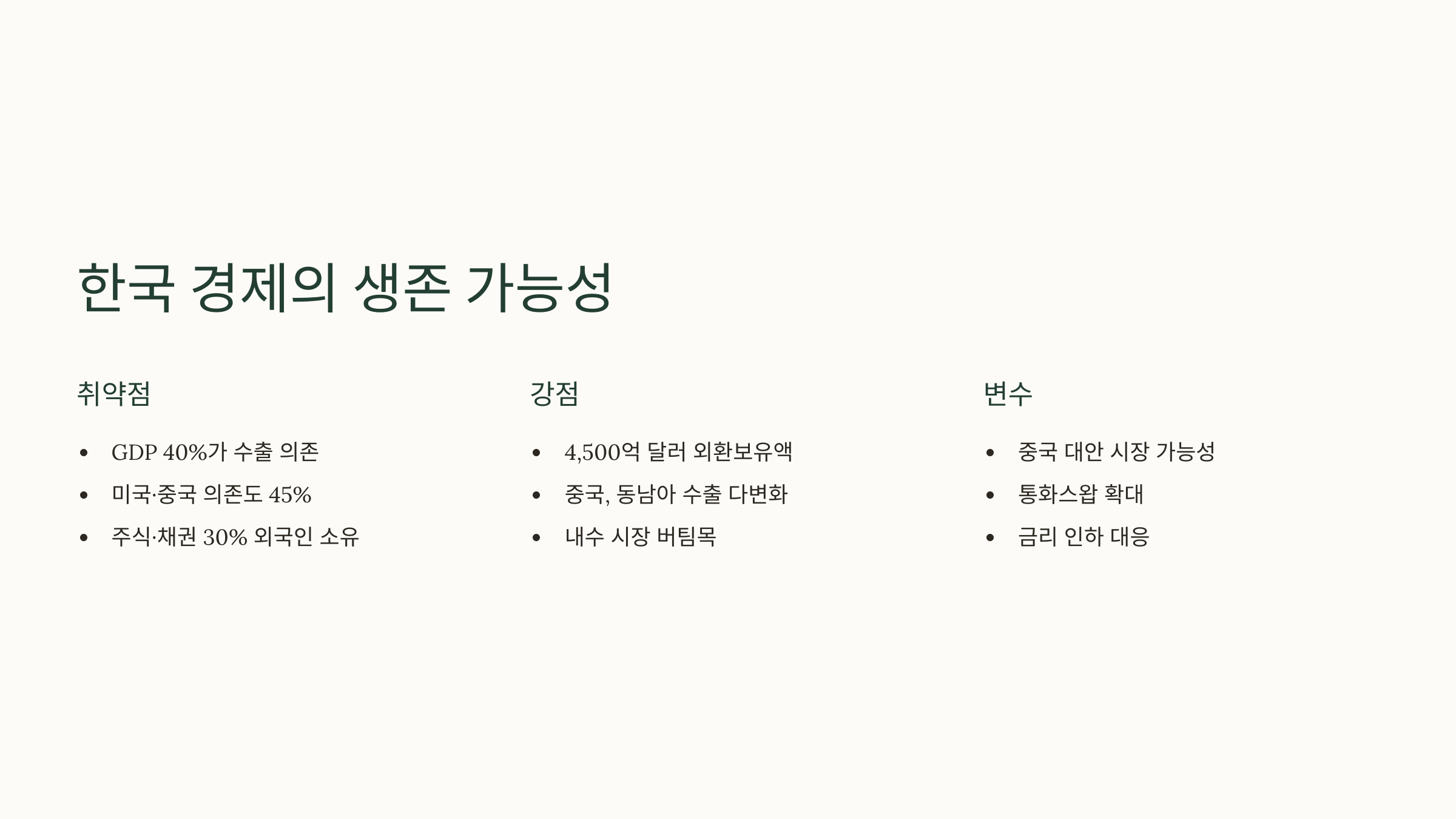 - 중장기: 수출 다변화(인도, EU로 10% 확대), 내수 활성화(소비 쿠폰, 세금 감면).