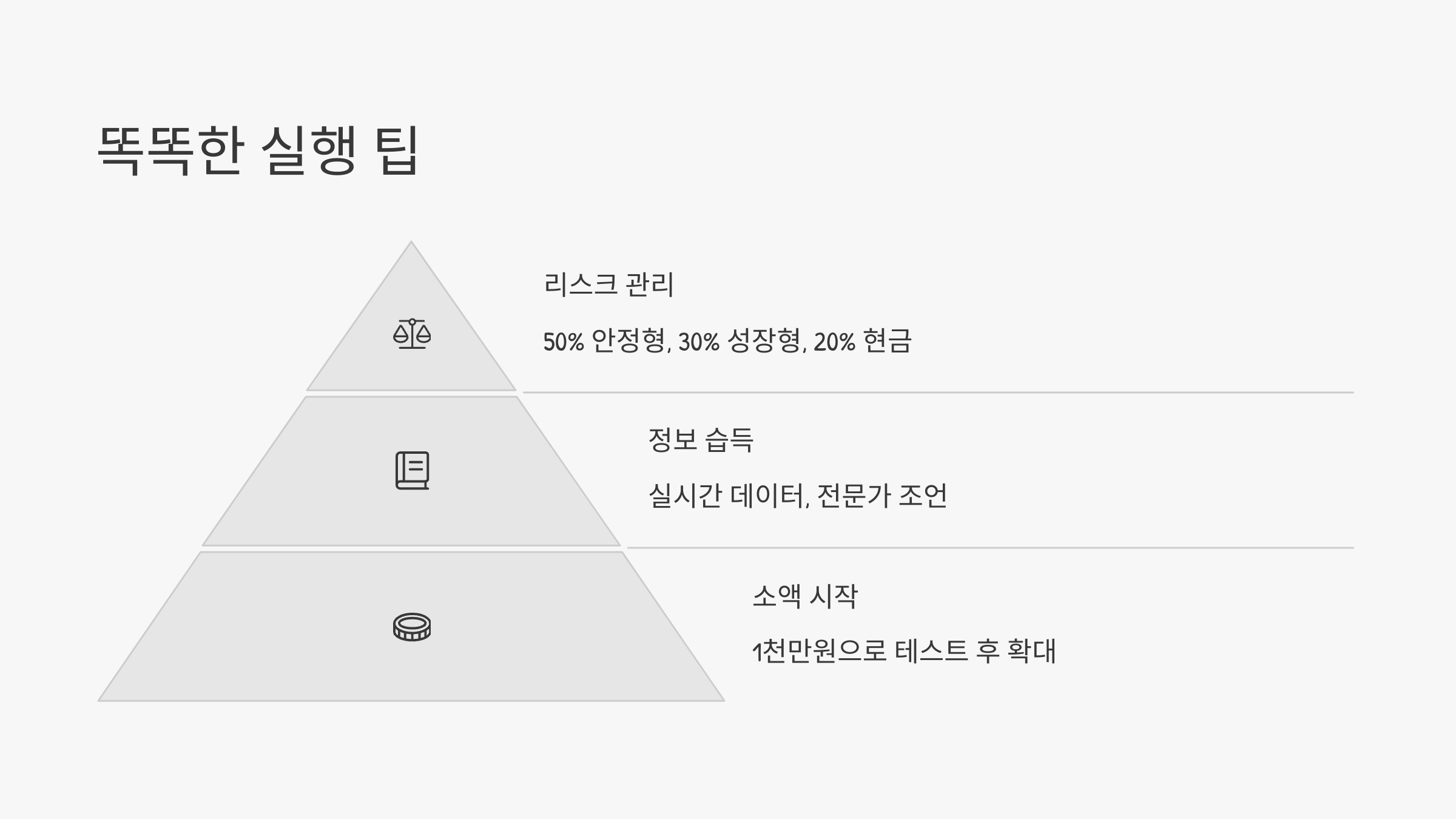 - 분산 투자: 자산 50%는 안정형(리츠, ETF), 30%는 성장형(주식), 20%는 현금 유지.