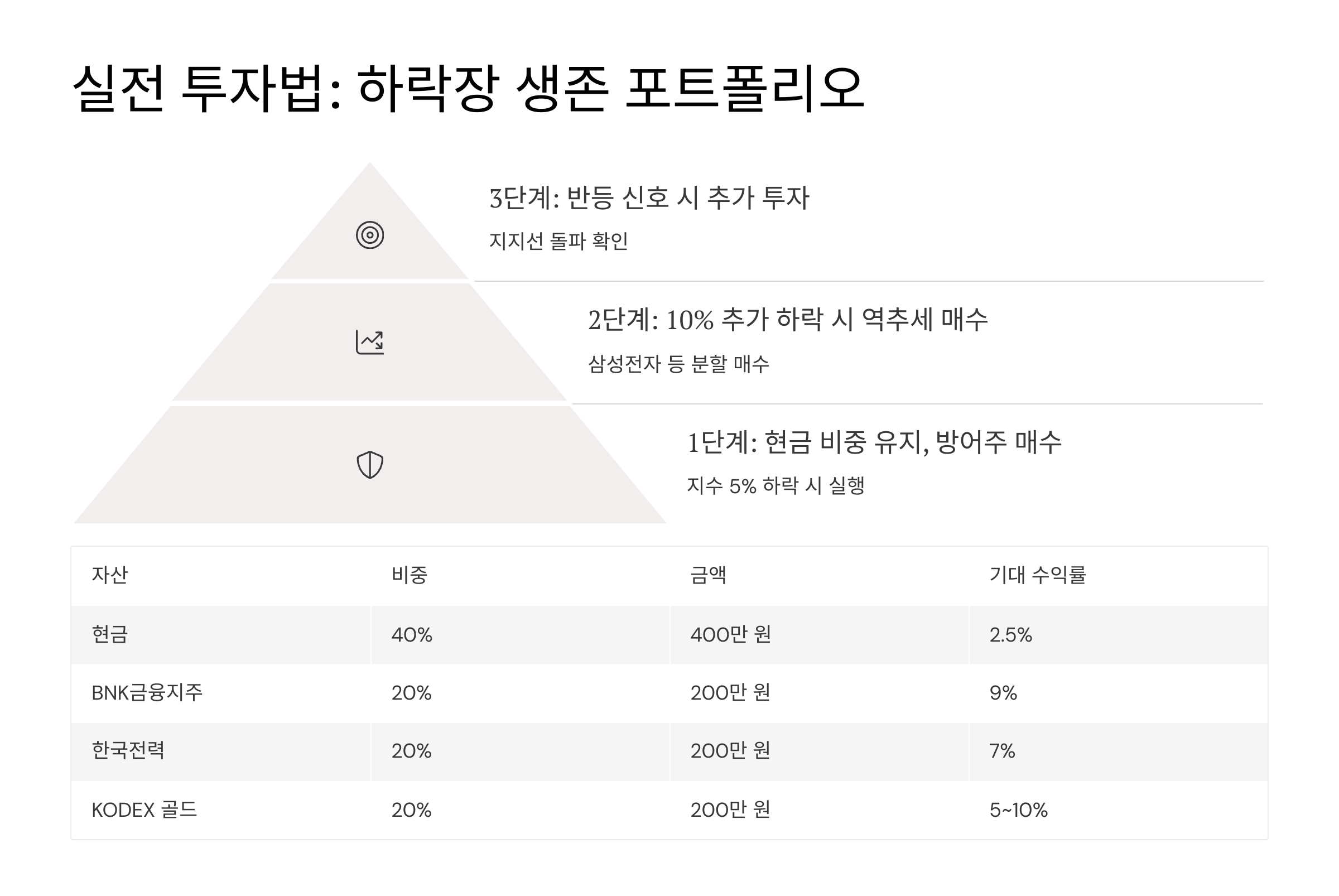 - 2단계: 10% 추가 하락 시 역추세 종목(삼성전자 등) 분할 매수.