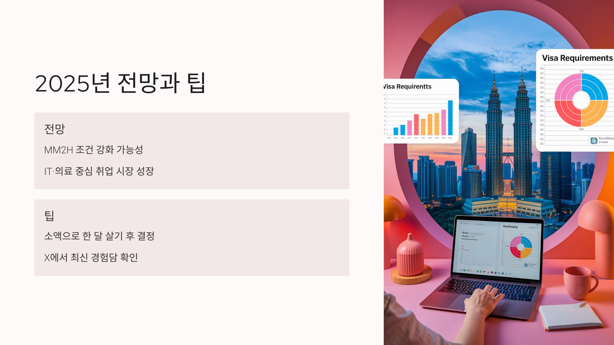 2025년이면 MM2H 조건 더 빡세질지도 모른대요(예치금 올릴 가능성). 반면 취업 시장은 IT랑 의료 쪽이 계속 커질 거라니까, 경력자라면 도전해볼 만해 보이고요. 저는 일단 한 달 살기(월 150만 원)로 맛보고 결정하려고요. 여러분도 X에서 후기 찾아보면 도움 많이 될 거예요!