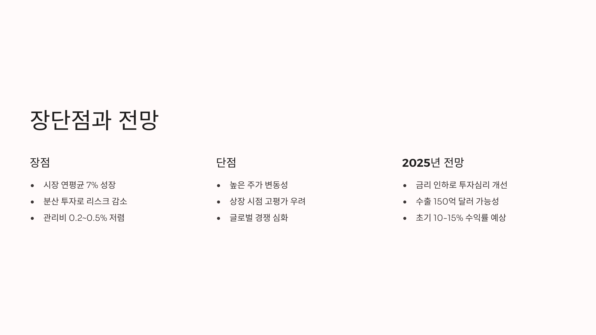 | 투자 편의 | 저비용, 분산 효과 | 과열로 고평가 위험 |