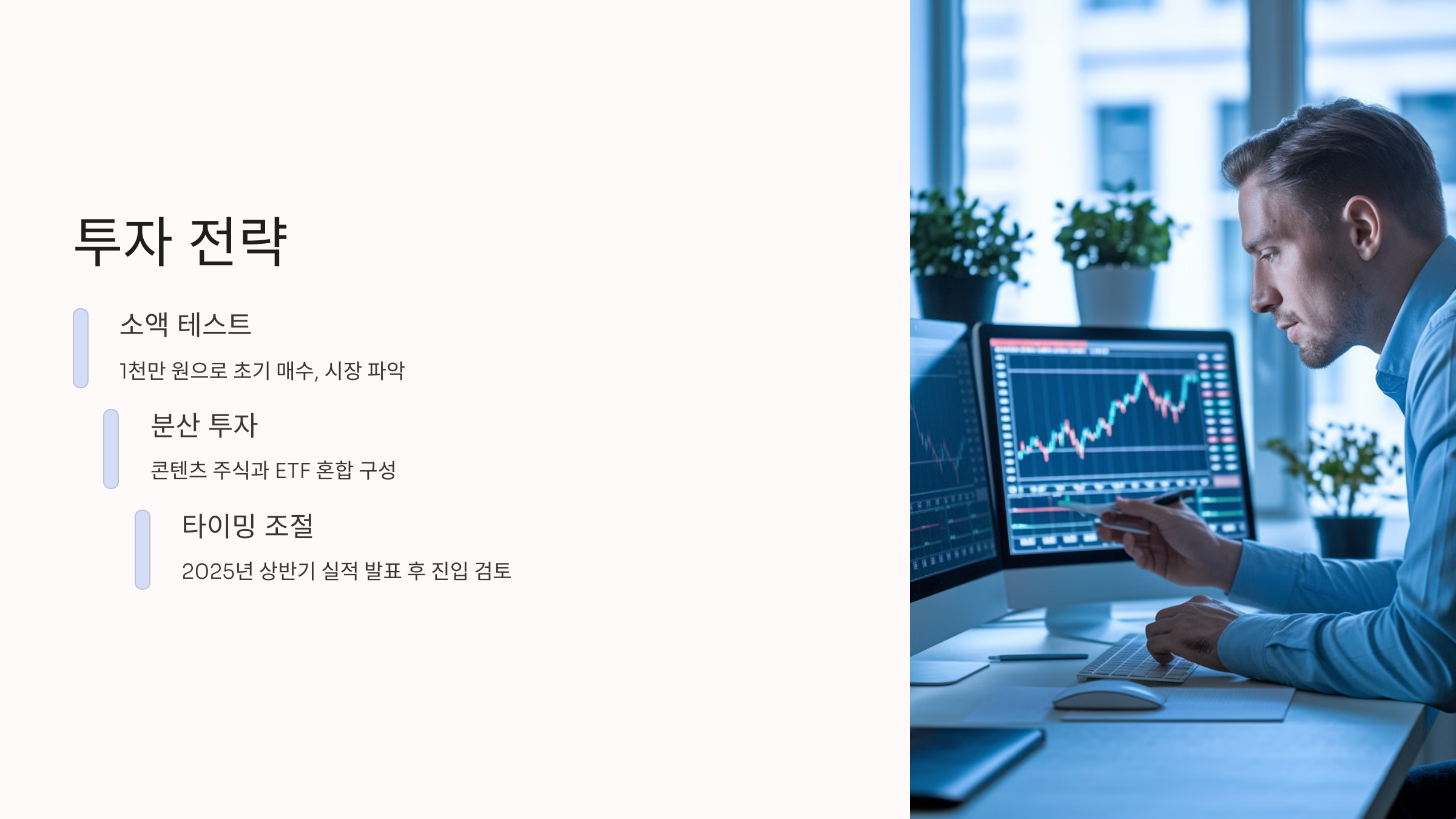 - 타이밍: 2025년 상반기 콘텐츠 수출 실적 발표 후 진입 검토.