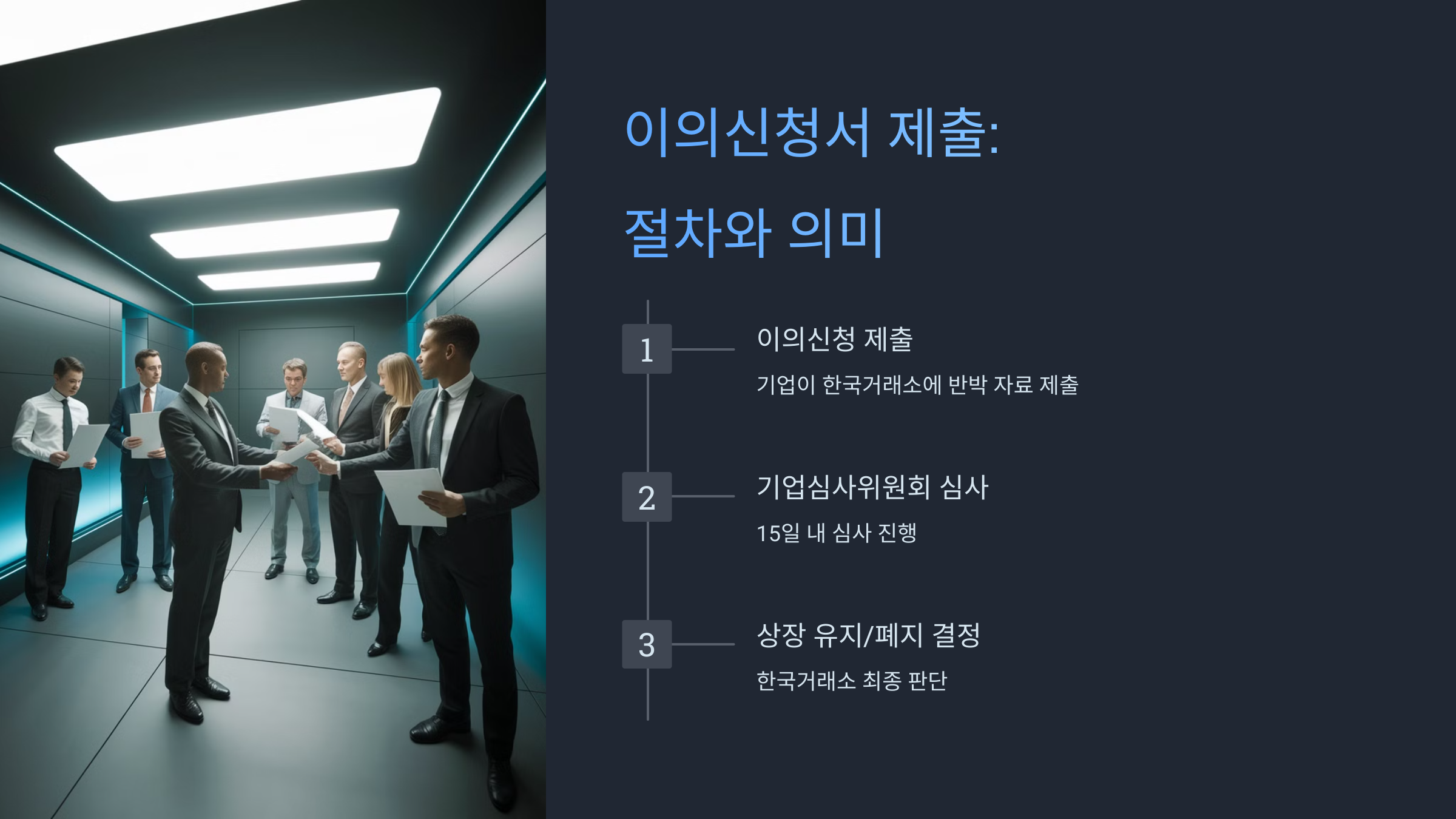 - 절차: 이의신청서 제출 → 기업심사위원회 심사(15일 내) → 상장 유지/폐지 결정(한국거래소).