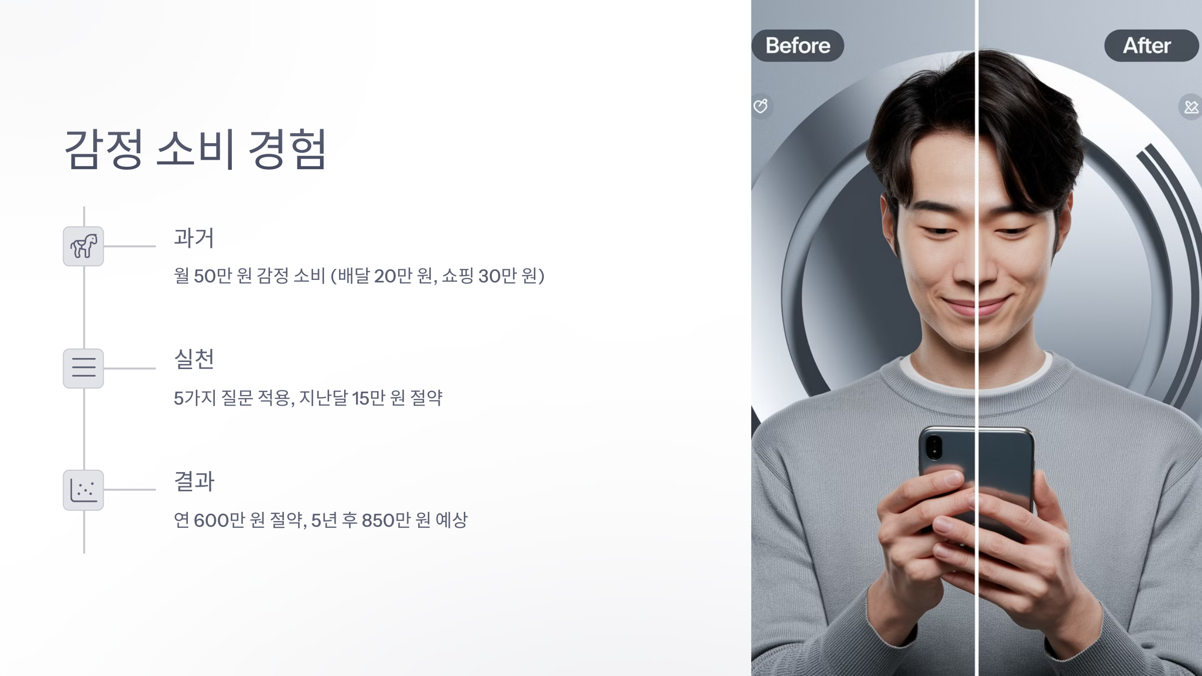 - 과거: 스트레스 풀려고 배달 음식(월 20만 원), 충동 쇼핑(월 30만 원).