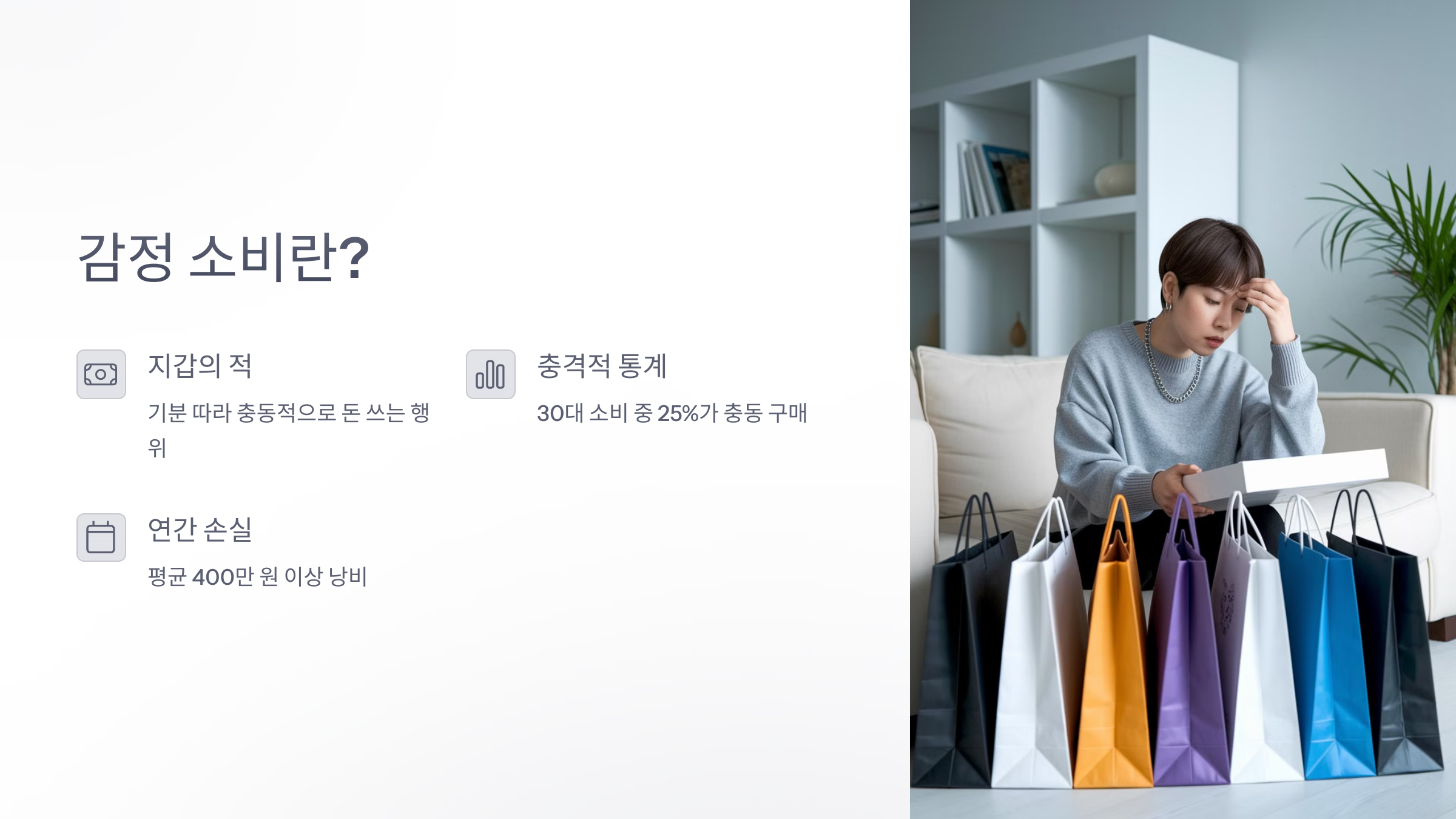- 왜 묻나: 화났거나 우울할 때 돈 쓰면 후회 확률 80%(2024년 소비자 조사).