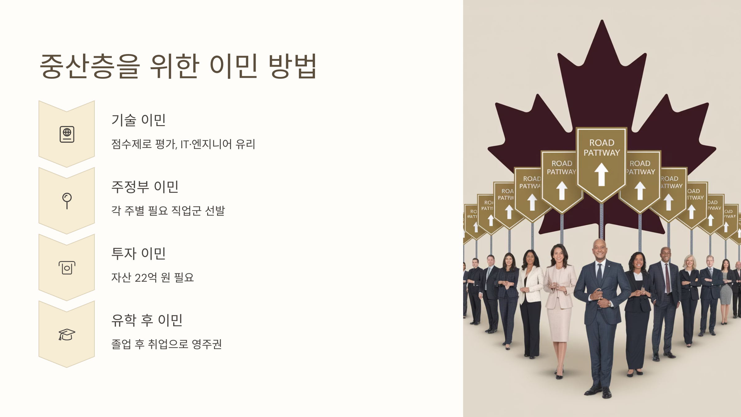 캐나다 이민은 크게 기술 이민, 주정부 이민, 투자 이민, 유학 후 이민으로 나눌 수 있어요. 중산층이 접근하기 좋은 방법 위주로 정리했어요.