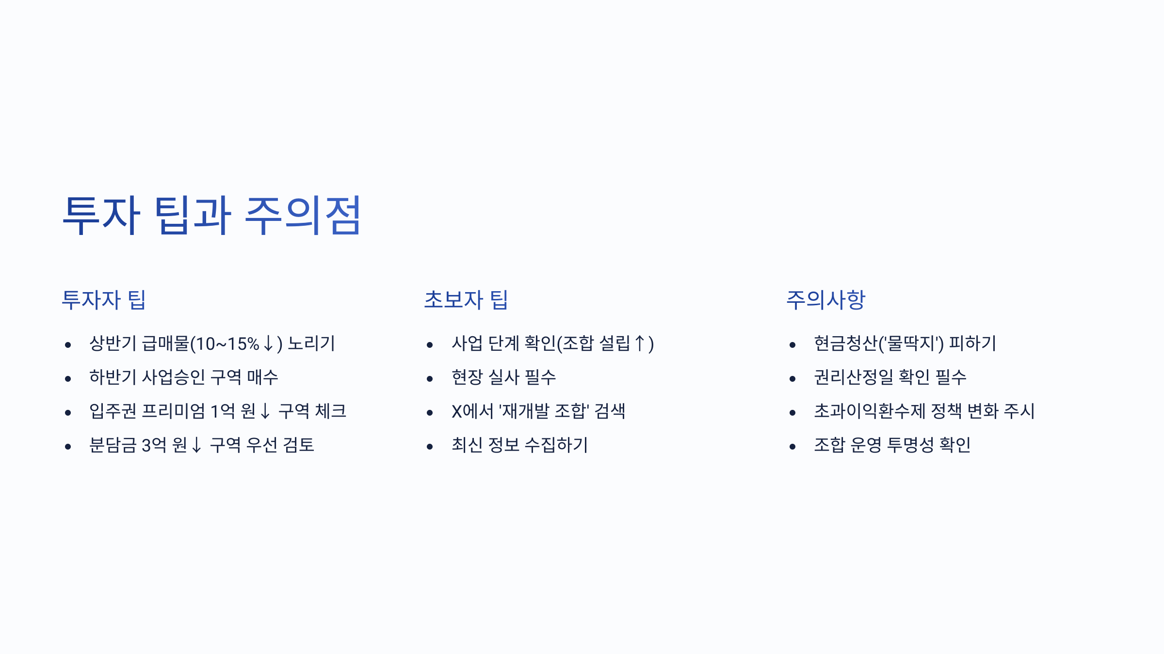 - 사업 단계 확인(조합 설립↑), 현장 실사 필수.