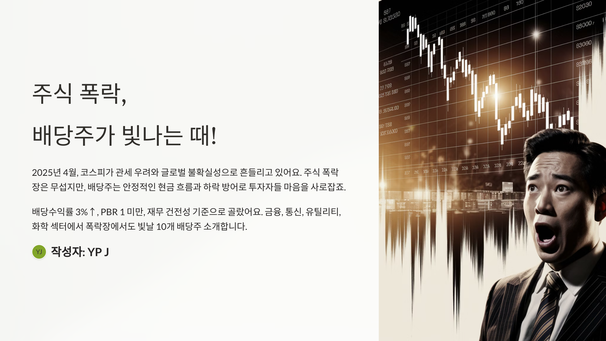 안녕하세요, 투자에 재미 붙인 평범한 직장인 JYP예요! 오늘은 2025년 4월 14일 새벽 12시 13분 PDT(한국 시간 오후 4시 13분), 집에서 따끈한 차 한 잔 들고 “주식 폭락! 지금이 기회, 국내 배당주를 노리다”라는 주제로 자료 정리하고 있어요. 환율 1,450원(한국은행 참고) 시대에 주식 시장이 흔들리면 배당주가 눈에 들어오죠. 작년 호주 시드니 여행 중 현지 투자자가 “폭락장은 배당주 사냥터”라던 말이 떠오르네요. 이번엔 일반 투자자 시선에서 국내 배당주 중 지금 매력적인 종목 10개를 쉽게 풀어볼게요. 조선비즈, 한국경제, 공시, 최신 데이터(2024~2025년) 기반으로 팩트 위주로 썼습니다!