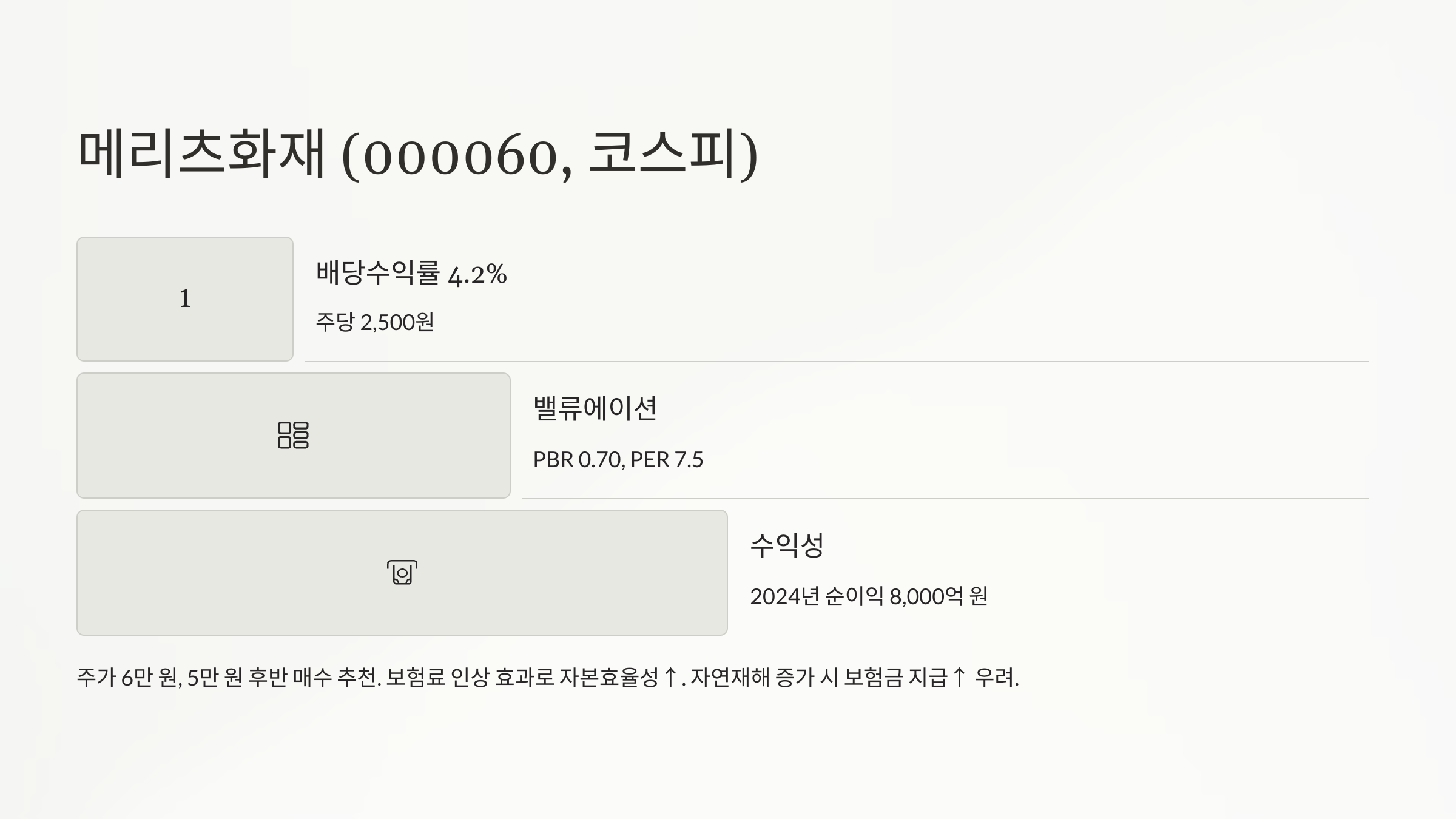 - 왜 매력적?: PBR 0.50, PER 7.0(업계 평균 9.0). 2024년 순이익 2.2조 원, 보험주 특성상 경기 방어적(조선비즈).