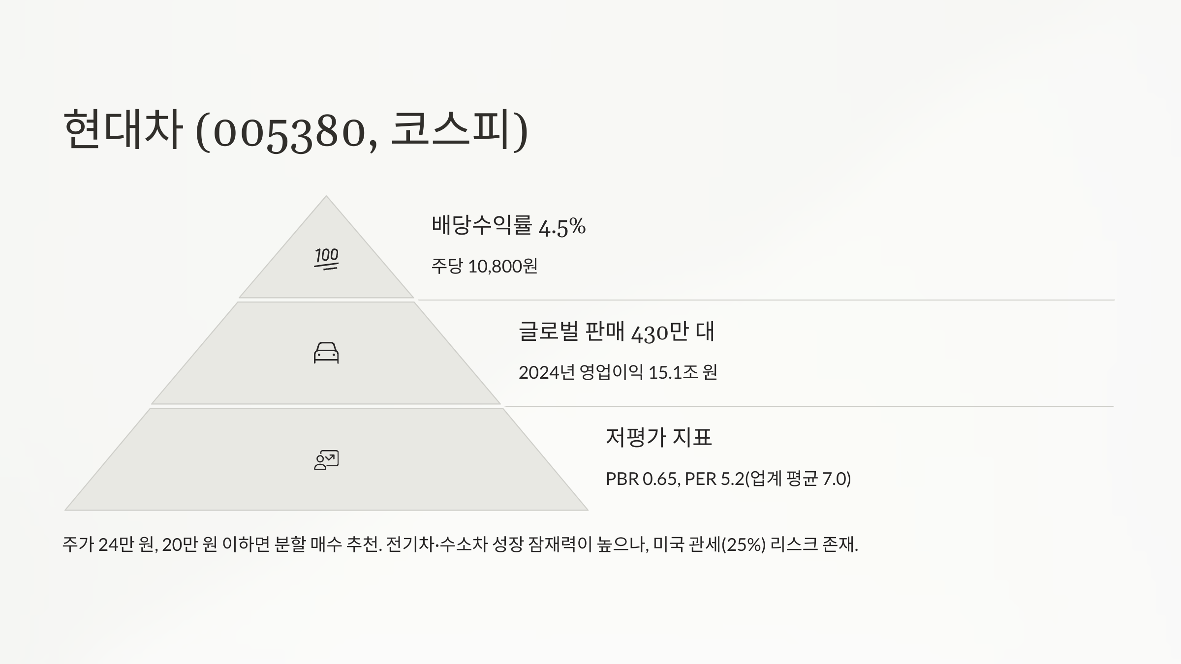 - 왜 매력적?: PBR 0.65, PER 5.2(업계 평균 7.0). 2024년 영업이익 15.1조 원, 글로벌 판매 430만 대(조선비즈).