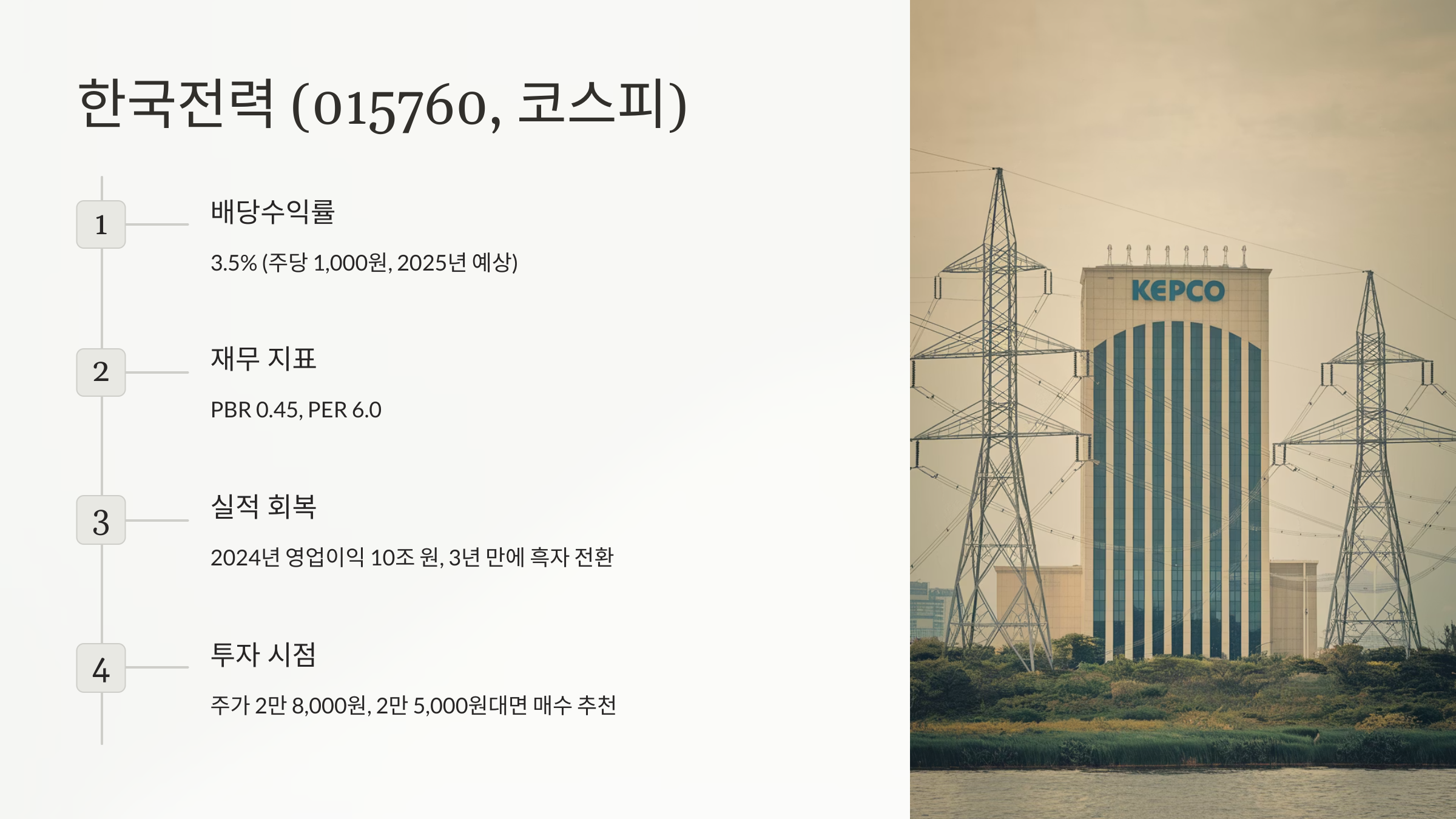- 왜 매력적?: PBR 0.45, PER 6.0. 2024년 영업이익 10조 원, 3년 만에 흑자 전환(한국경제). 유틸리티주로 방어적.