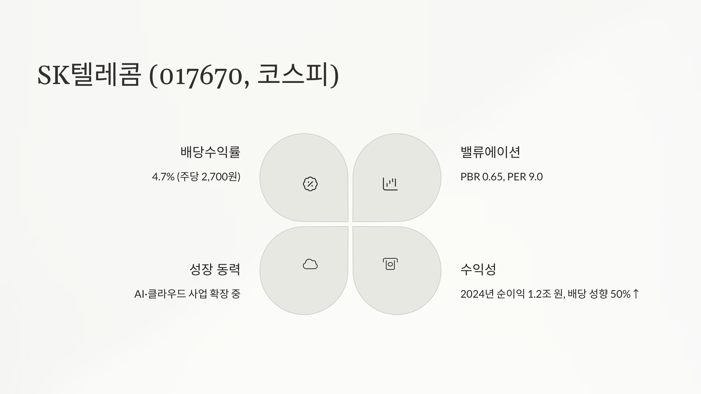 - 왜 매력적?: PBR 0.65, PER 9.0. 2024년 순이익 1.2조 원, 배당 성향 50%↑(조선비즈). AI·클라우드 사업 확장 중.