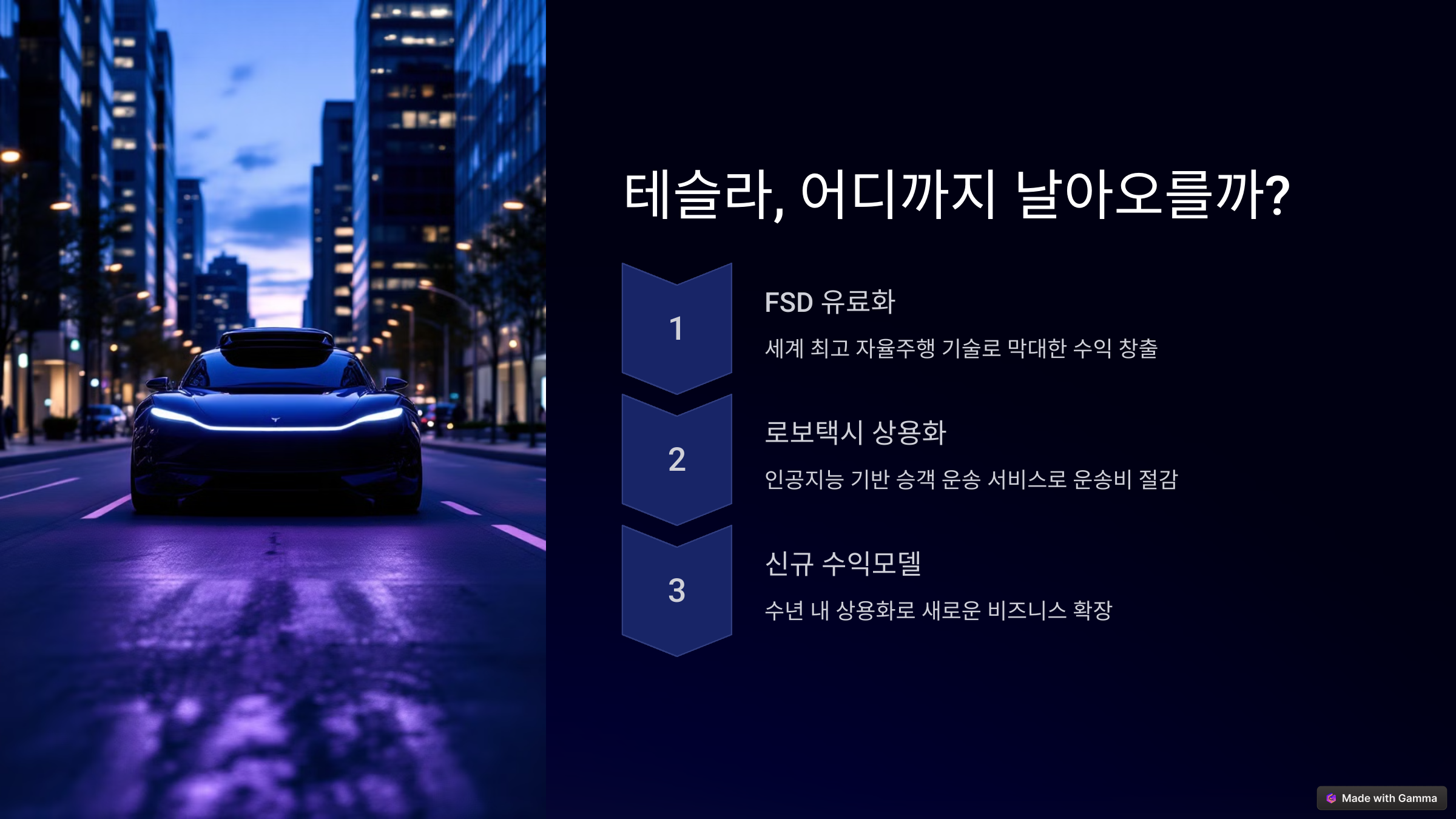 - 로보택시 시대의 개막: 테슬라는 로보택시 상용화를 통해 모빌리티 산업을 혁신할 계획입니다. 로보택시는 인공지능과 자율주행 기술을 기반으로 승객을 운송하는 서비스입니다. 테슬라는 자체 개발한 로보택시 플랫폼을 통해 운송 비용을 절감하고, 새로운 수익 모델을 창출할 수 있습니다. 로보택시의 상용화 시점은 기술 발전과 규제 환경에 따라 달라질 수 있지만, 전문가들은 수년 내에 상용화될 것으로 전망하고 있습니다.