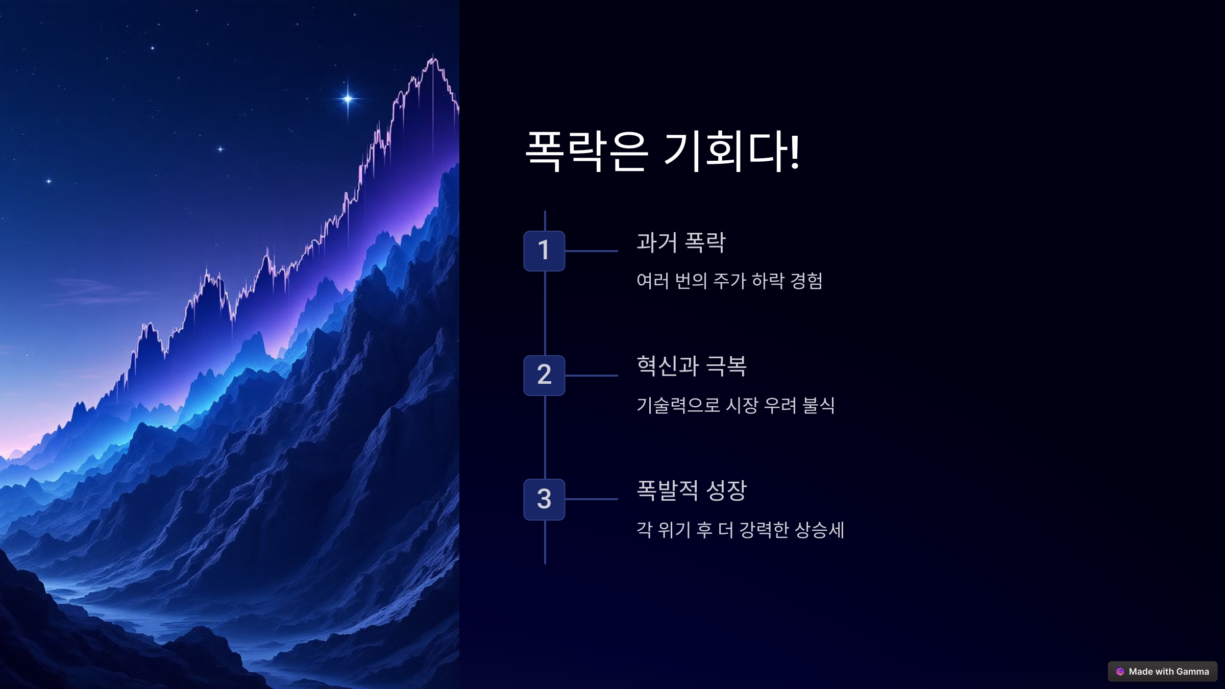 주식 시장은 역사적으로 폭락과 상승을 반복해왔습니다. 과거 테슬라 역시 여러 차례 폭락을 경험했지만, 그때마다 혁신적인 기술과 압도적인 성장세로 시장의 우려를 불식시키고 강력한 상승장을 만들어냈습니다. 이전 폭락장 후의 드라마틱한 상승장을 기억하십시오. 이번 폭락 역시 테슬라가 더욱 높이 날아오르기 위한 도약대가 될 수 있습니다.