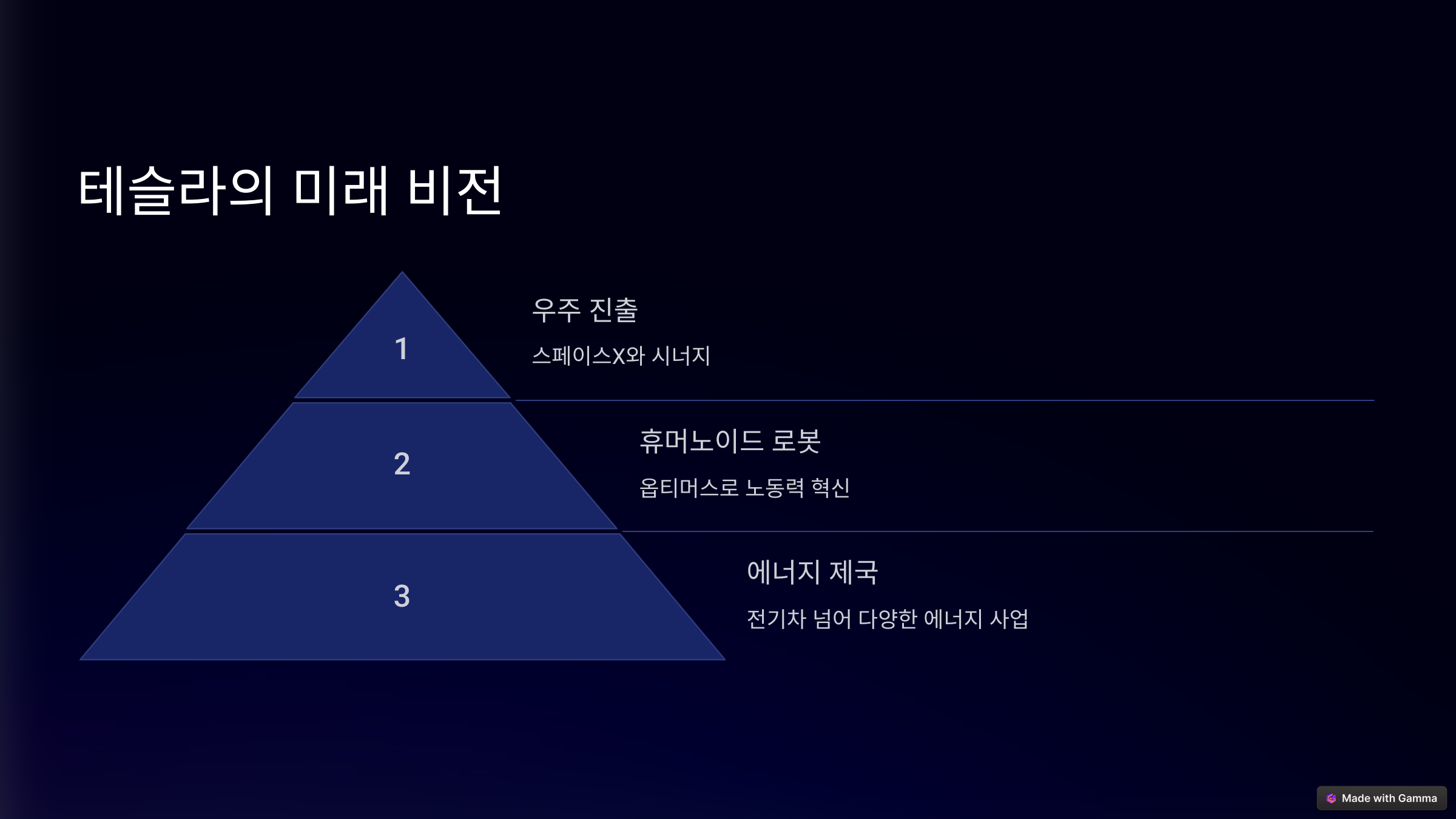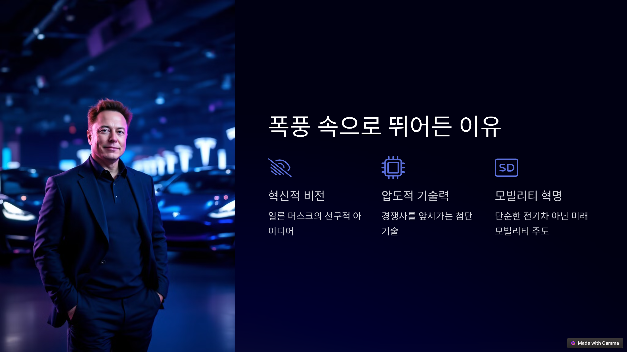 - 로봇 시대 개막: 테슬라는 휴머노이드 로봇 '옵티머스'를 개발하고 있습니다. 옵티머스는 미래 사회의 노동력을 대체하고, 우리의 삶을 더욱 편리하게 만들어 줄 것입니다.
